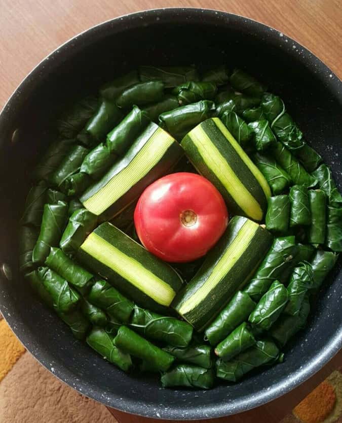 The “shirts” are then filled with the meat and rice stuffing and arranged in a pot. They are covered with water, spices, tomates, and usually the parts of the onion that weren’t used previously.