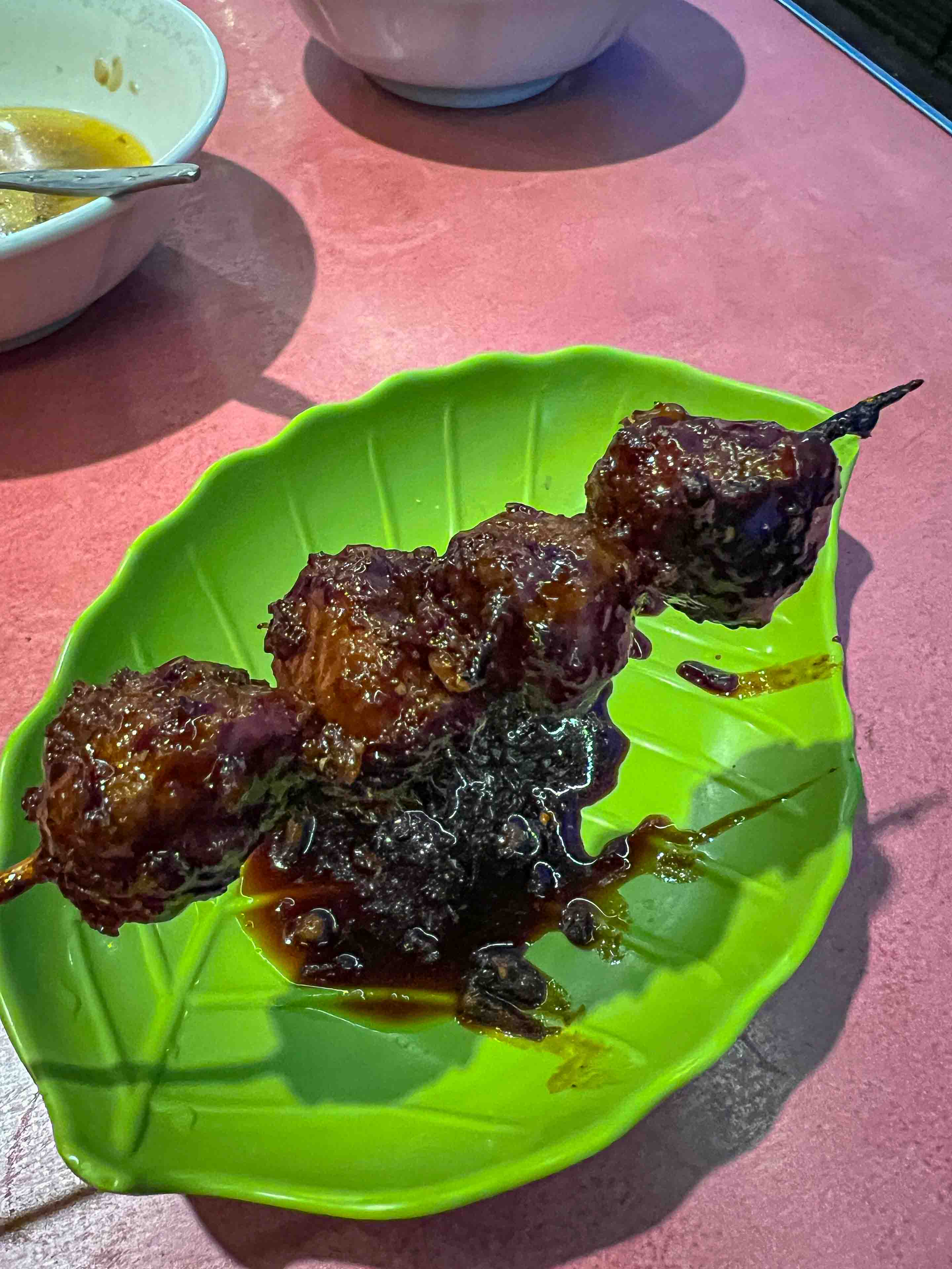 In Malang they often serve it in three portions on a skewer and the middle is a piece of fat grilled over the hot coals.